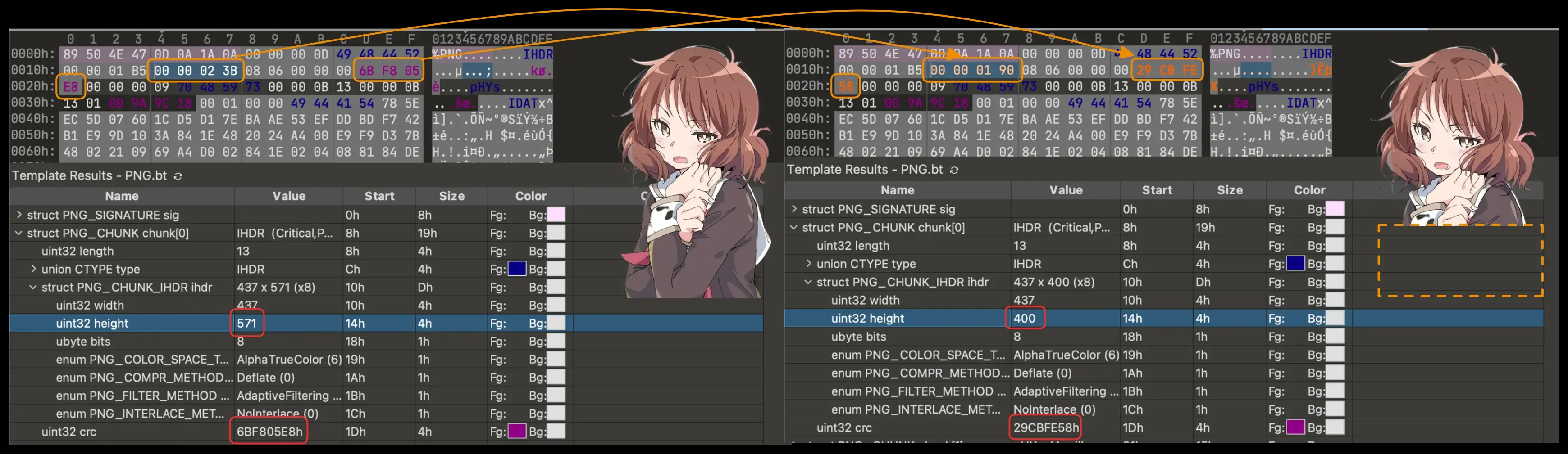- 因此题目可能会故意修改 IHDR 中的高度数据,使之显示不全