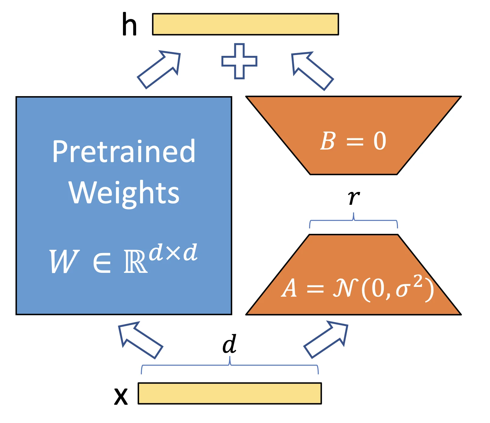 这样,我们不直接训练大矩阵 \(W_0\),而是只训练这两个小矩阵 \(B\) 和 \(A\),其中 \(r\)(秩)远远小于 \(d\) 和 \(k\),比如 \(r = 4\)。