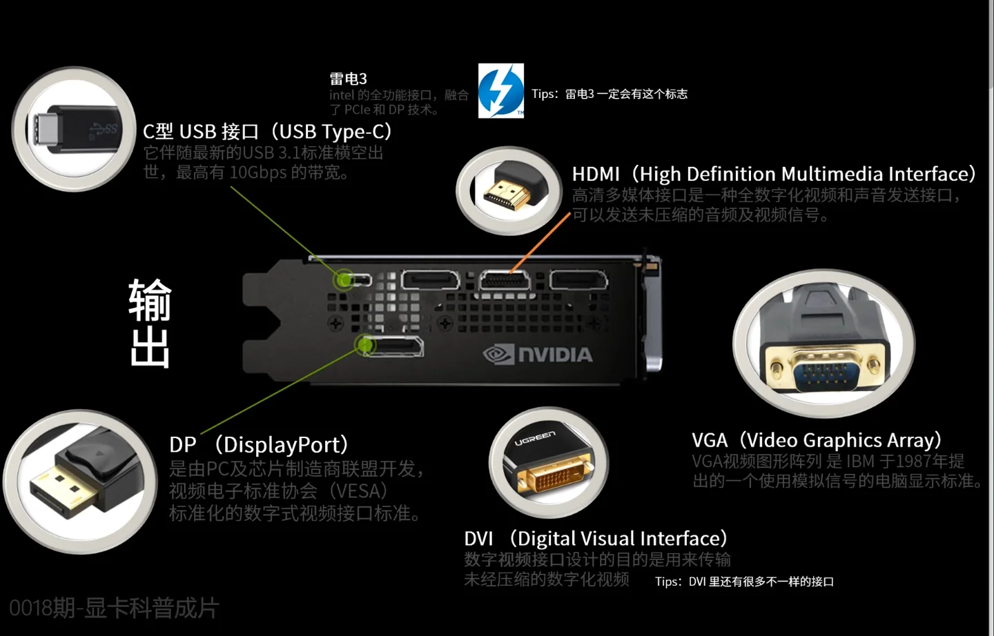 输出部分就是显卡挡板处的接口,有:VGA、DVI、HDMI、DP、USB-C(包括雷电 3)