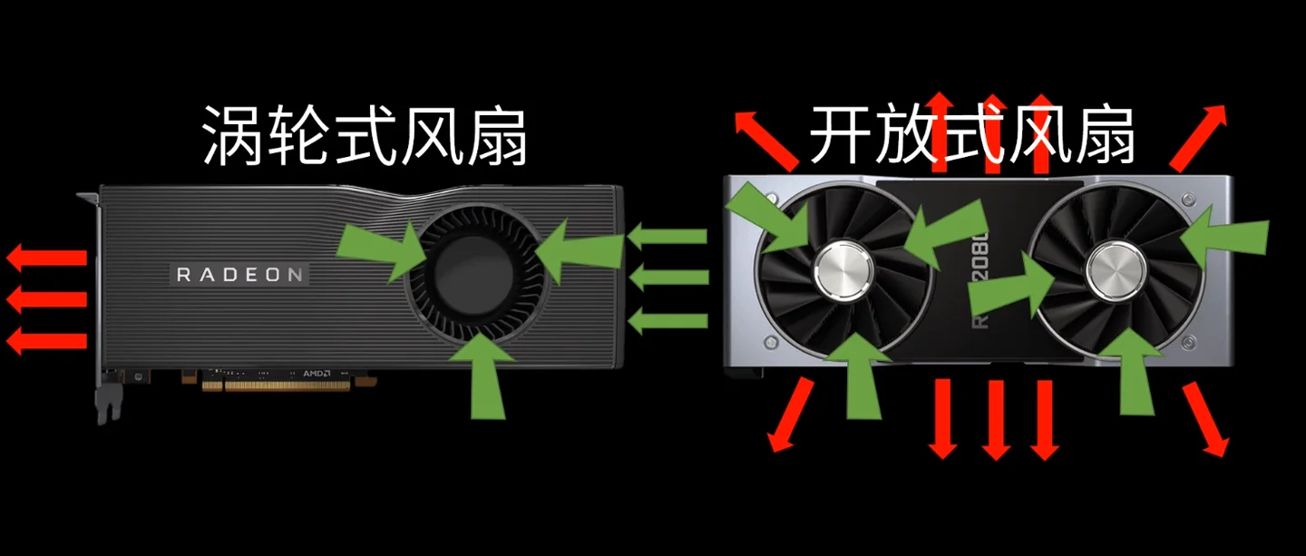 开放式风扇是直接吹显卡(鳍片)来提供散热,使用场景比较广泛,有无风道都能用,而且相较而言更静音。涡轮风扇散热则是靠吸入风量横吹核心(鳍片