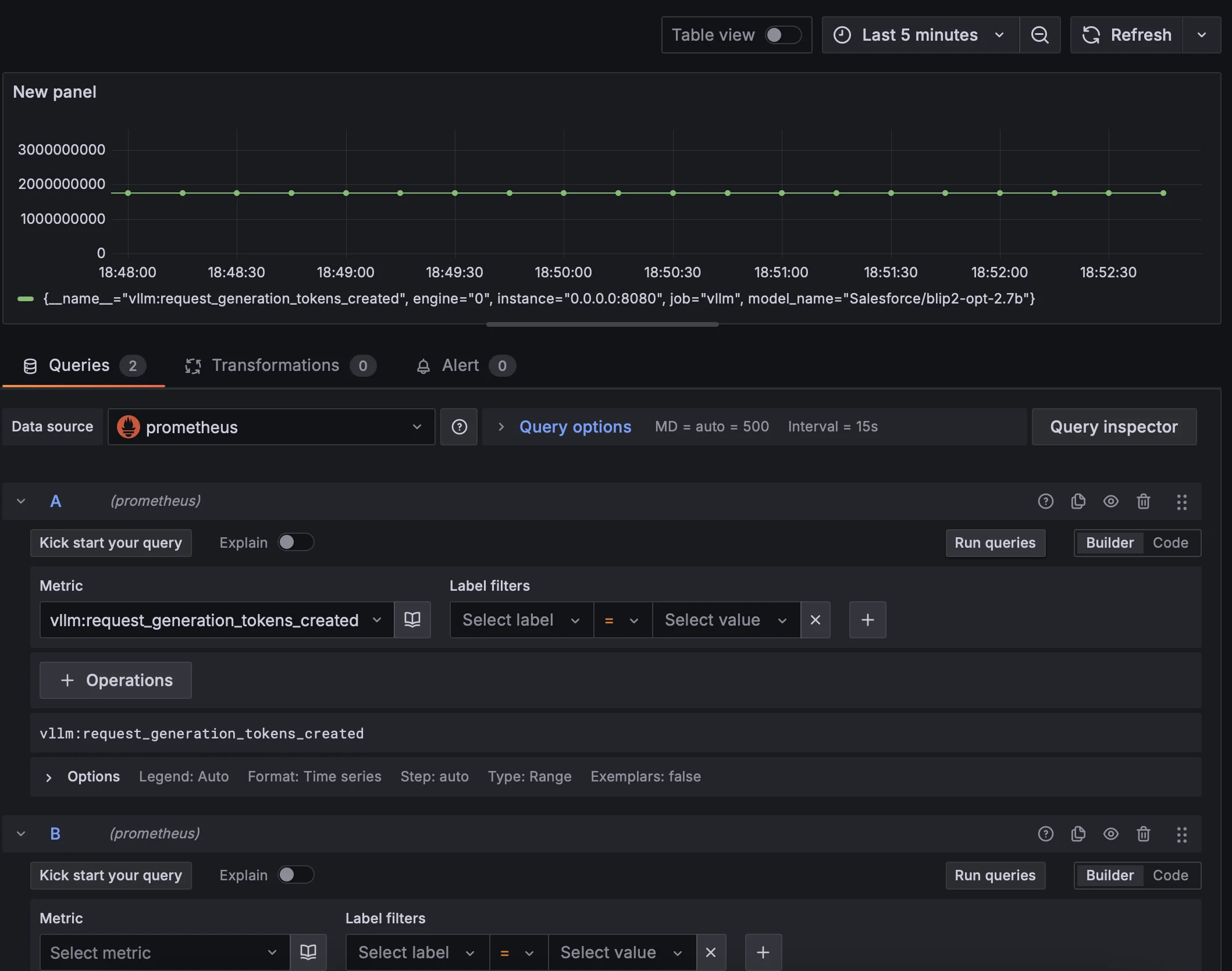 ) 。 - 在“查询”字段中输入任何 Prometheus 表达式,同时使用“指标”字段通过自动补全查找指标。