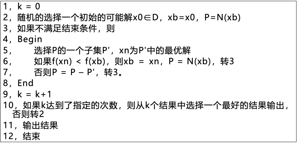 - 解决方法:随机生成一些初始点,从每个初始点出发进行搜索,找到各自的最优解。再从这些最优解中选择一个最好的结果作为最终结果