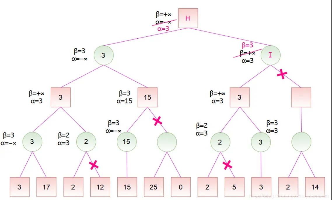 - 若在某一节点更新后出现 \(\alpha>\beta\),则其后面不需要再进行更新,直接剪枝即可