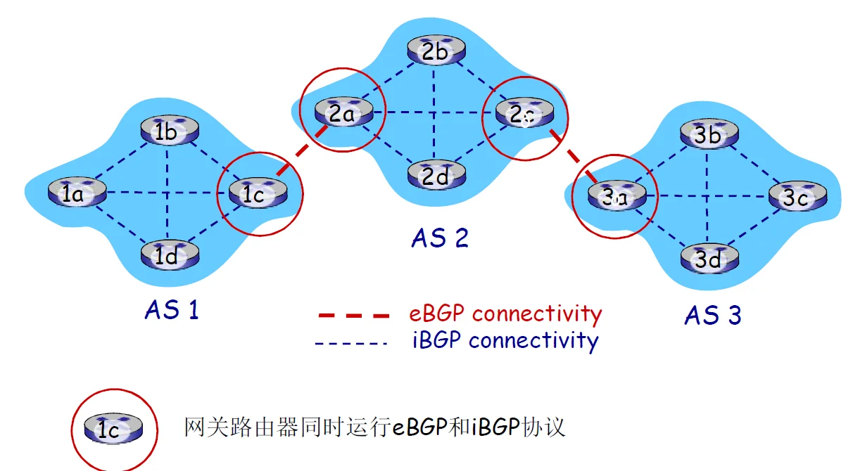 eBGP: 从相邻的 ASes 那里获得子网可达信息;转发子网收到的其他 AS 子网可达信息,将iBGP得到的信息通过eBGP传出去