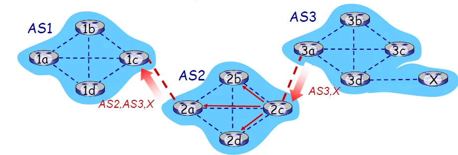 当 AS3 网关路由器 3a 向 AS2 的网关路由器 2c 通告路径: AS3,X