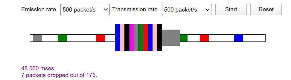 平均分组数量 \(Ls=p + \frac{1}{2} \cdot \frac{p^2}{(1-p)}\) 平均排队延时 \(Wq=\frac{p}{2u(1-p)}\)
