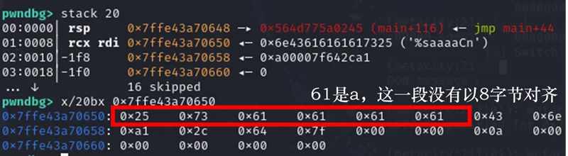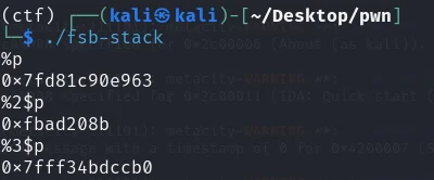 %p: 将数据以十六进 制格式打印 , 带前导0x$: 指定参数位置 , 需要计算偏移确定要打印第几个参数- 栈上存在的数据包括栈地址、程序段地址、libc 地址,也可能会有堆地址
