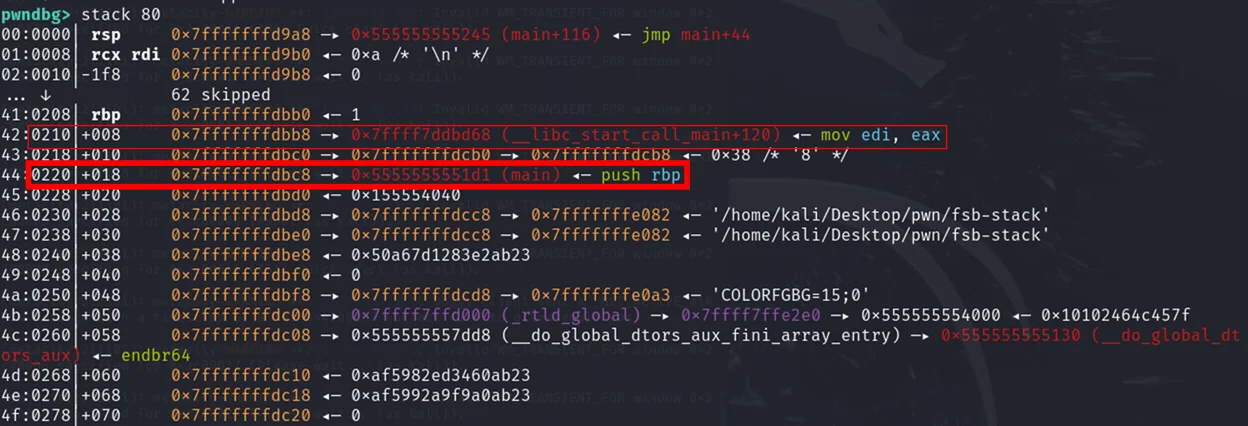比如说我们想把 main 函数的地址泄露出来,可以通过%number$p 来泄露