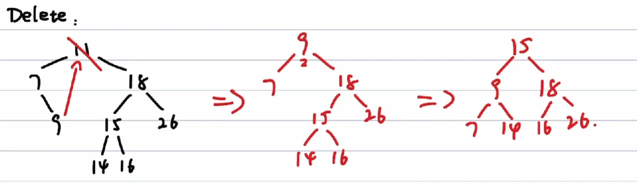 如果节点有两个儿子,用其右子树的最小数据代替该节点的数据并且递归删除那个节点