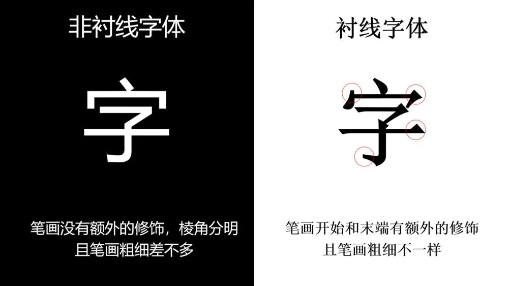 我们很明显就能看出,笔画开始和末端没有修饰,笔画粗细差不多的字体,就是非衬线字体