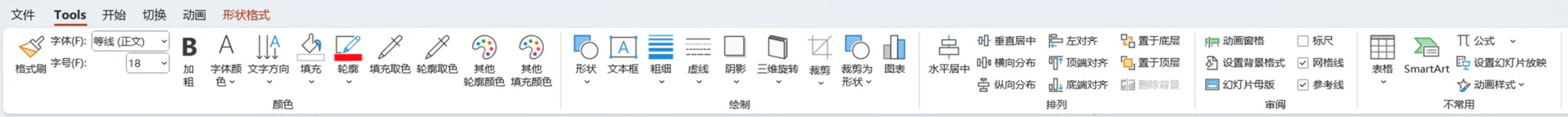 经过一些 ppt 制作的过程,我迭代了一版我使用频率较高的工具,制作成了一个单独的工具栏,并隐藏了一些使用频率不高的菜单栏。