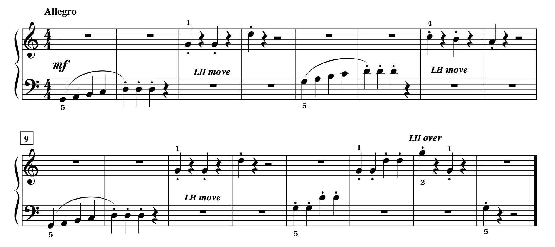 (1) 观察 C 大调自然音阶各音之间的距离 , 将其推广 , 以任意音作为起始音构建自然音阶 . 从这里写出的自然音阶中 , 观察在黑键上的音的个数 , 并且学习 " 调号 " 概念 , 试着把在一 (1) 中写出的旋律移调到其他自然音阶上 , 如 G, F, D, A, bB 自然音阶 . 这一阶段需要对常用的记谱规范作一个归纳 , 不然容易走歪 .