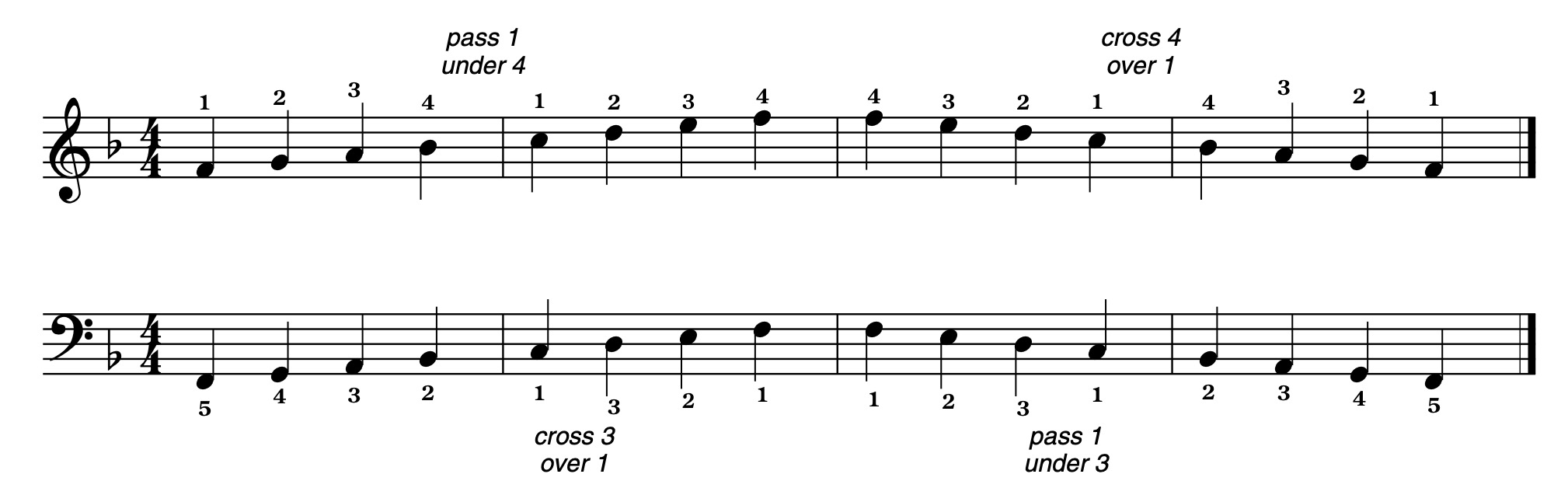 - 低音谱号:位置在低音 4,上加一线是 1,尾巴上面的间是 1,最下是 5