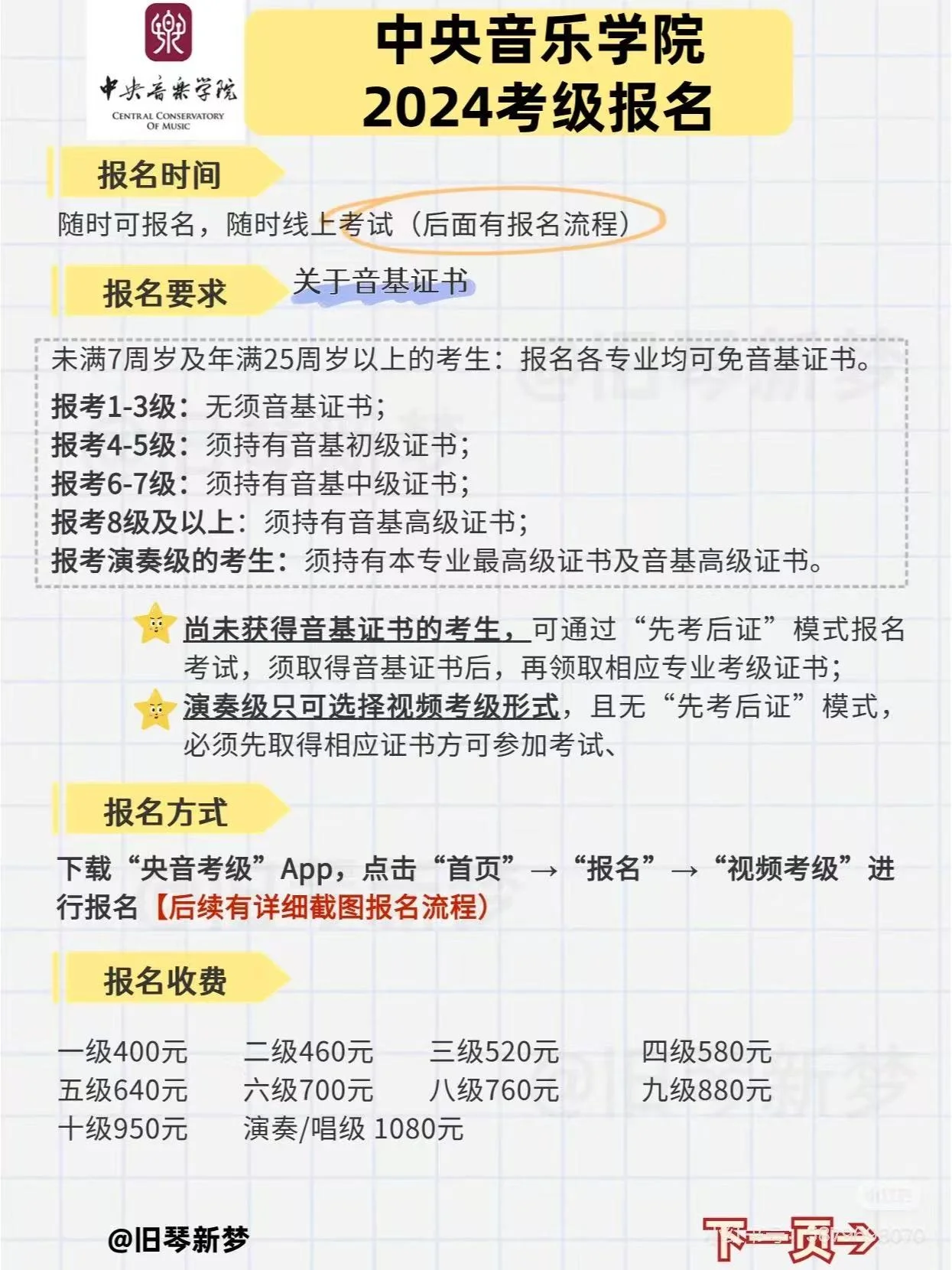 考级有不同的机构,下面以中央音乐学院为例