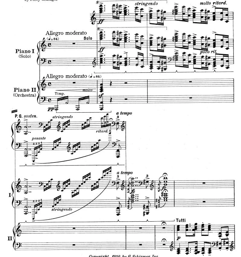 第一钢琴写 solo 第二钢琴写 orchestra ;缩编谱,用钢琴演奏乐队的效果