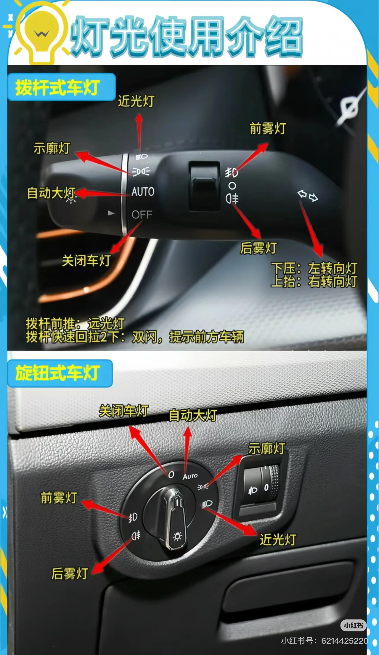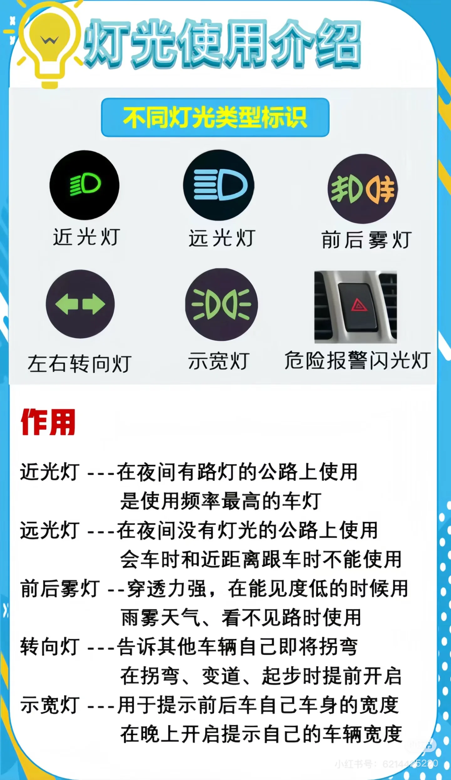 - 远光灯 : 小心使用远光灯,避免对其他车辆和行人造成干扰。及时关闭