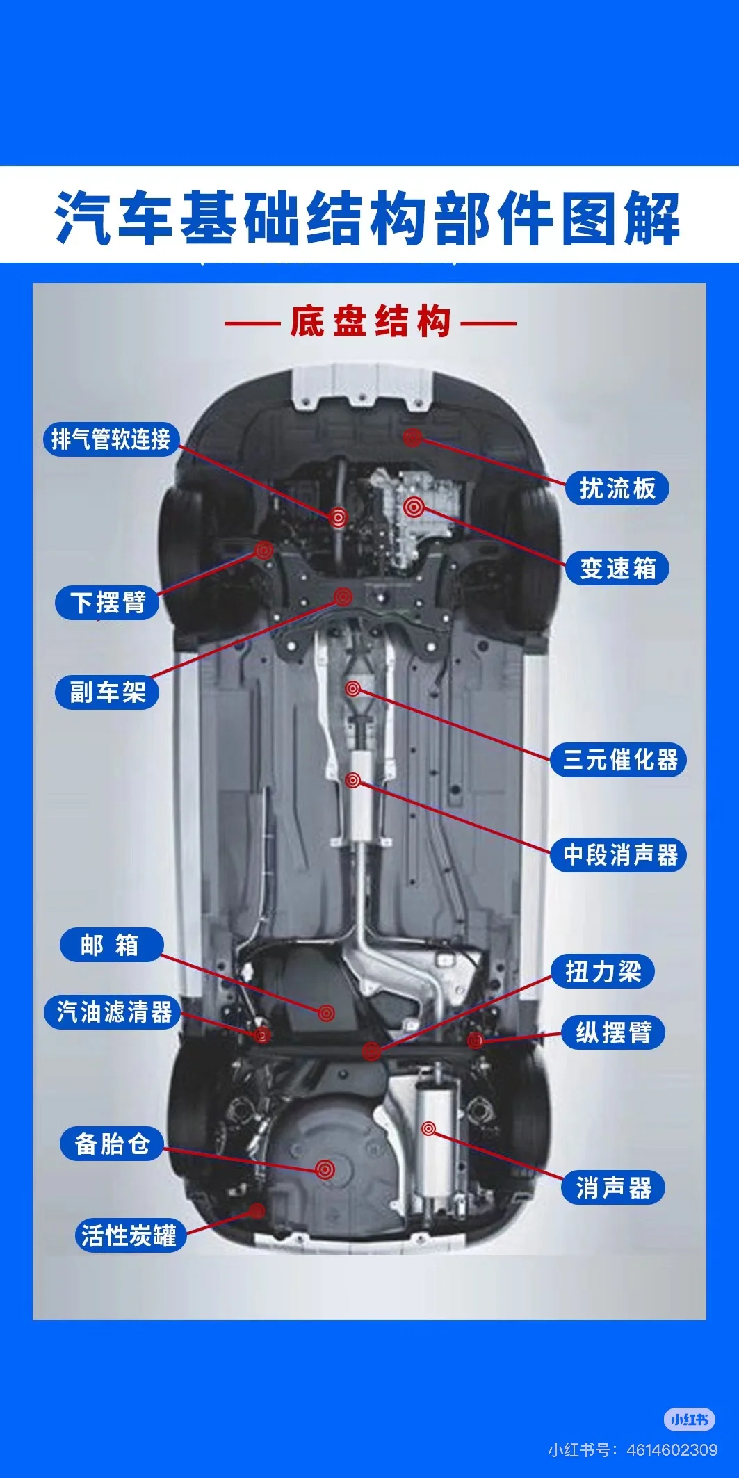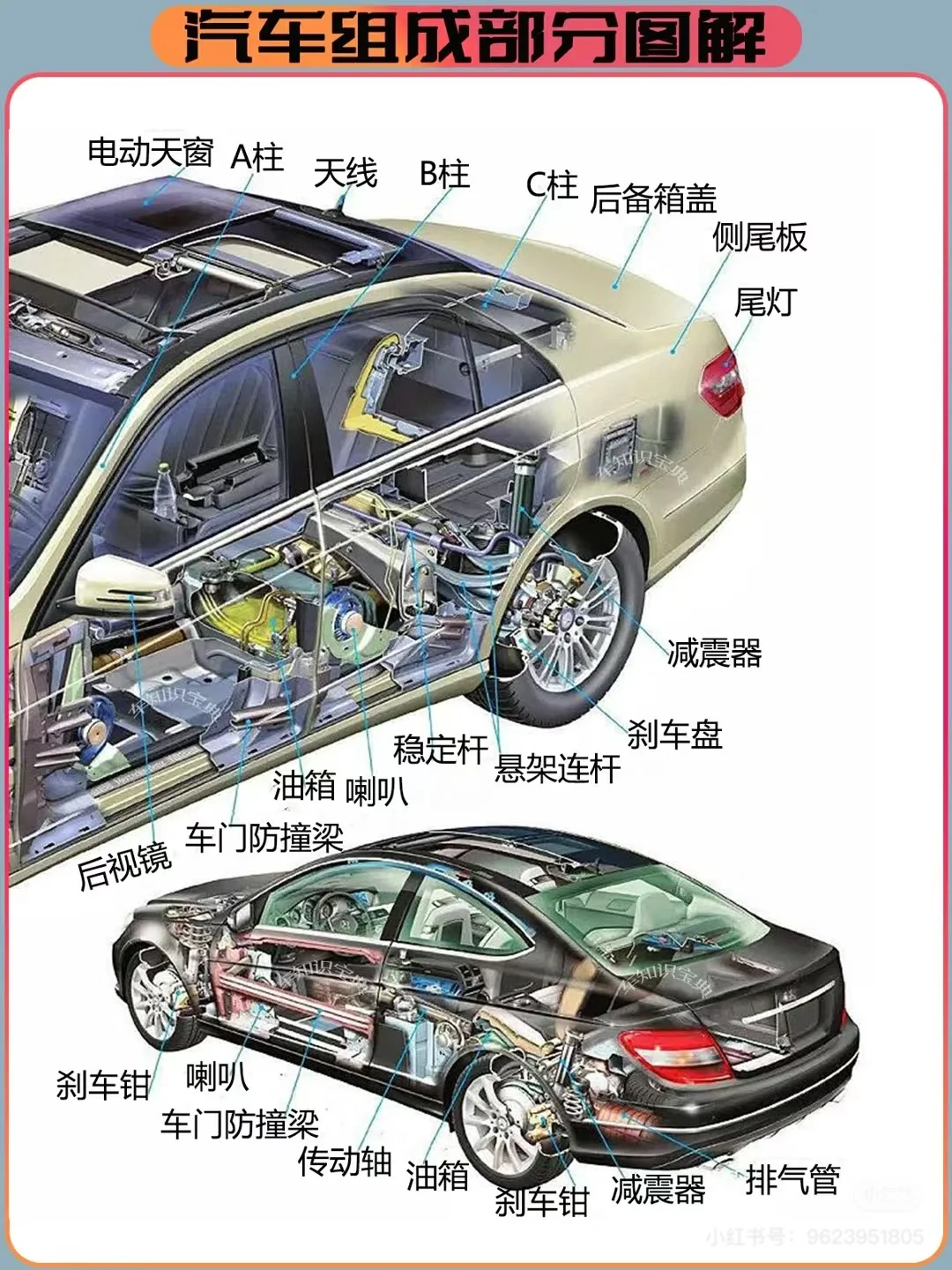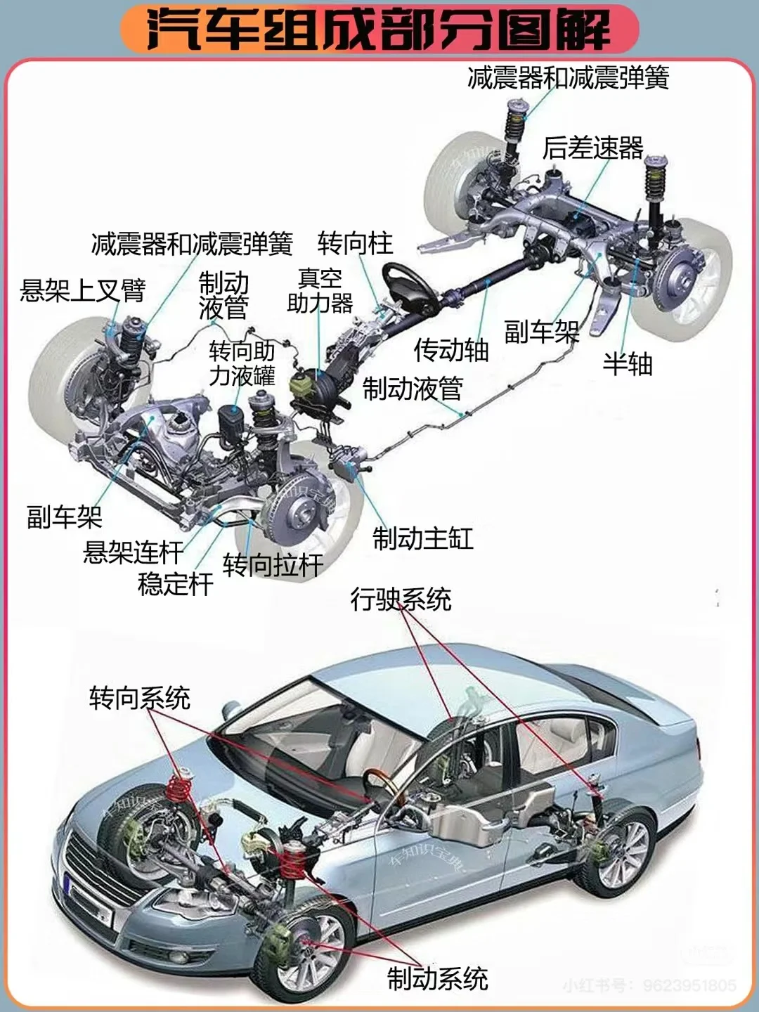 底盘 (Chassis): 支撑汽车重量并保持稳定性,包括悬挂系统、转向系统和制动系统等。