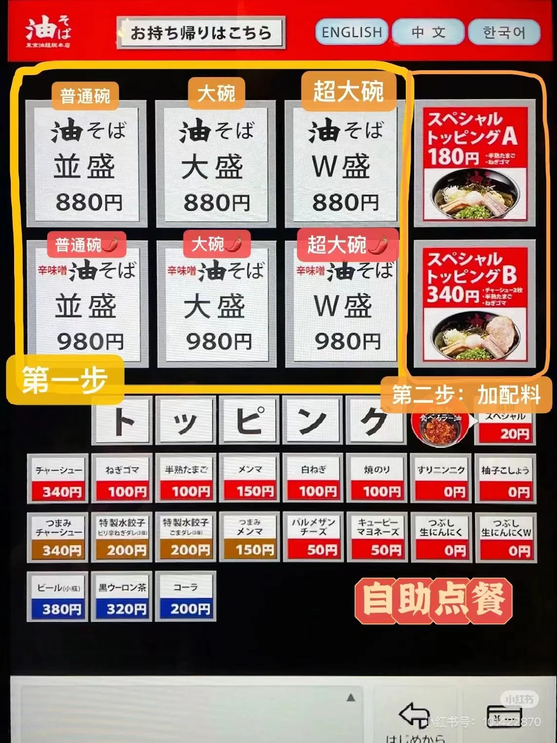 最上面是分量,可以选小碗,大碗、超大碗。也可以选加辣版