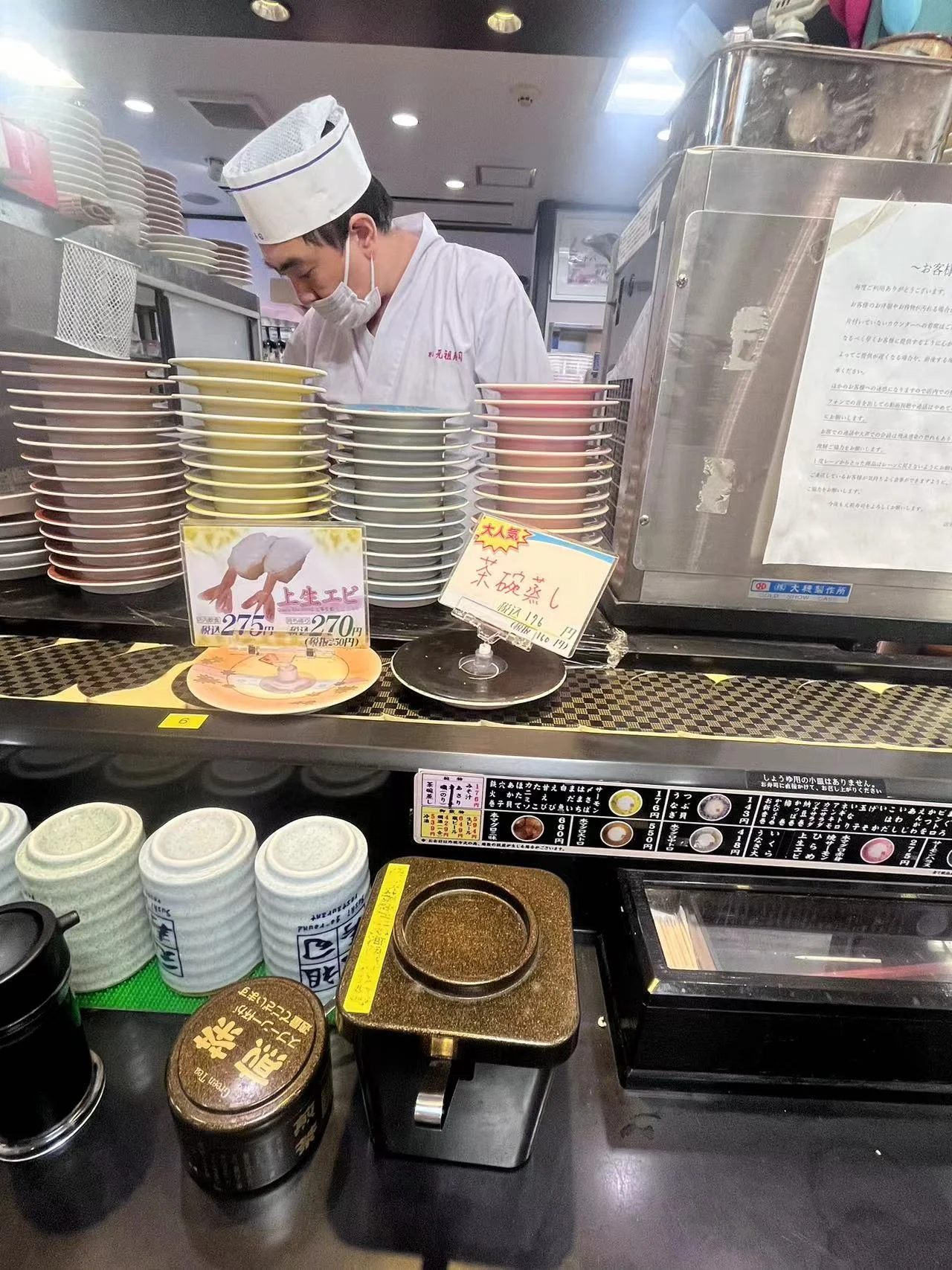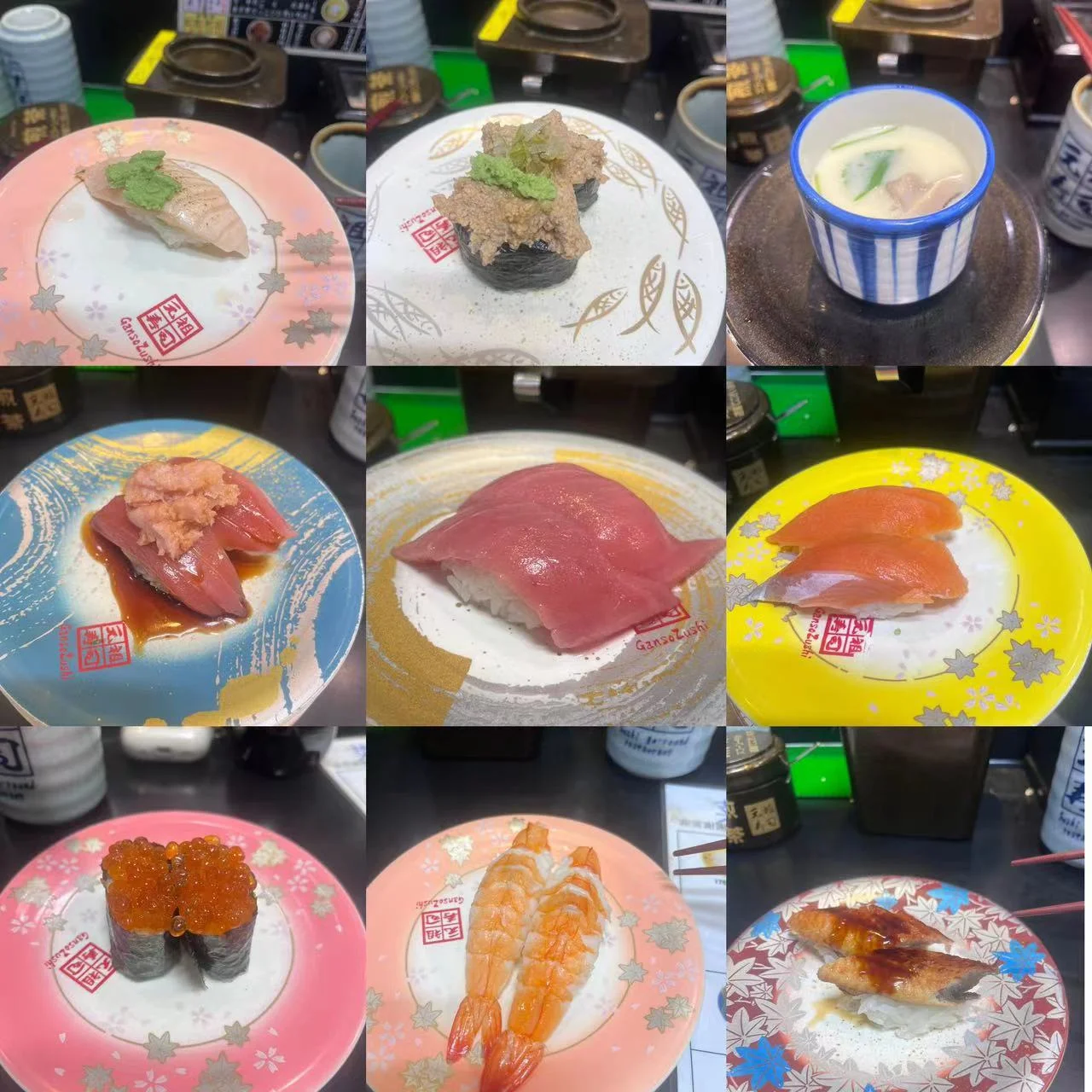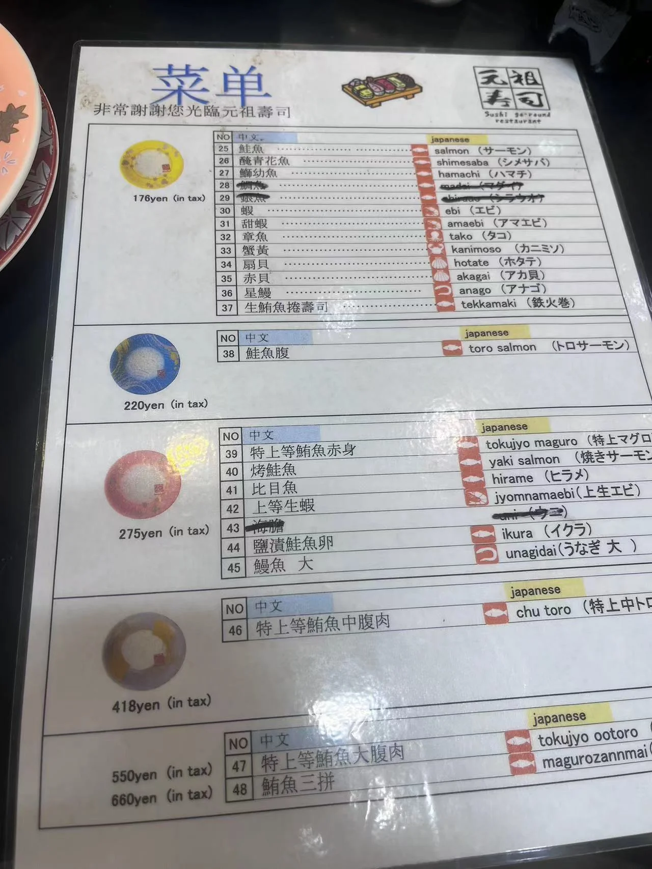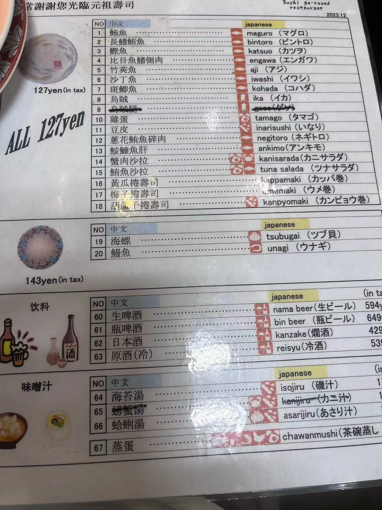点菜的话可以直接取转盘上的,也可以向店员询问一份中文菜单。 不同颜色的盘子对应不同的价格,一般是100-500yan不等。