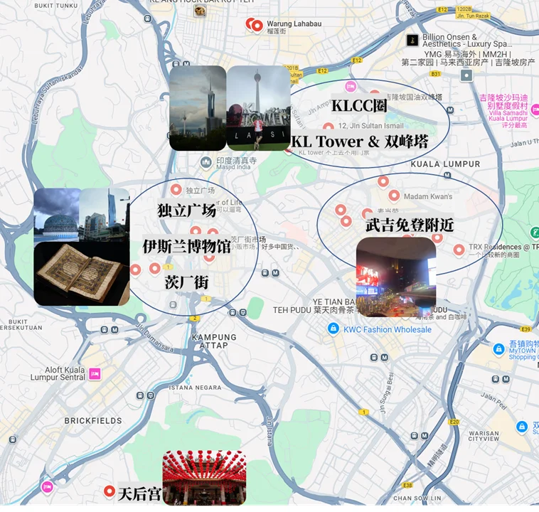 - KLCC 附近 : 有经典的双峰塔 ,KLCC 公园 , 吉隆坡塔