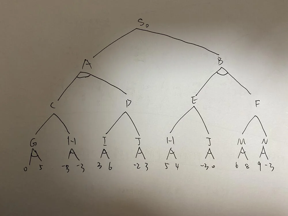 这题给了一个对抗搜索树,在最末端给出了他们的值,要求把每一个节点的值都表示出来;然后进行 αβ 剪枝。