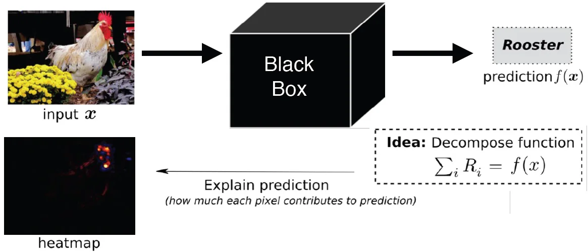 LRP calculates the attribution (i.e., relevance, importance) of each pixel \(i\) in the input image x to the model prediction \(f(\mathscr{x})\)