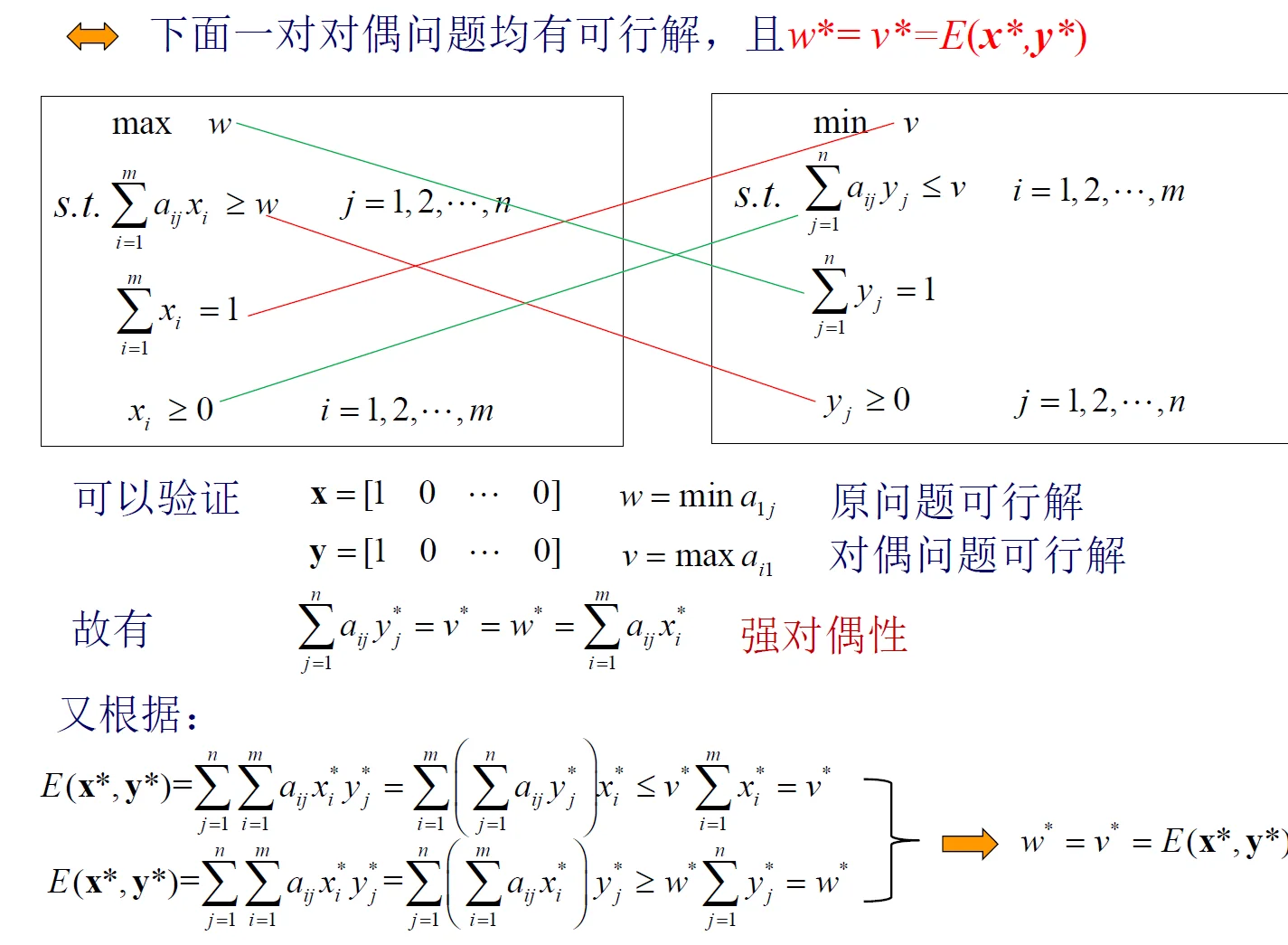 两者关系:\(\max _{x \in S_{1}^{*}} \min _{y \in S_{2}^{*}} E(x, y) \leq \min _{y \in S_{2}^{*}} \max _{x \in S_{1}^{*}} E(x, y)\)