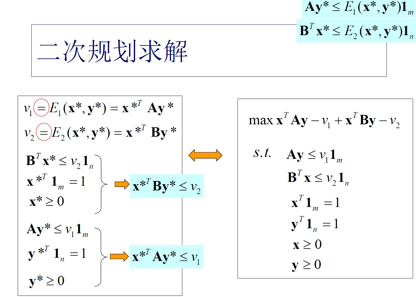 - 定理 : \(\left(x^{*}, y^{*}\right)\) 是 \(G=\left\{S_{1}, S_{2} ; A, B\right\}\) 的 Nash 均衡解的充要条件为 :