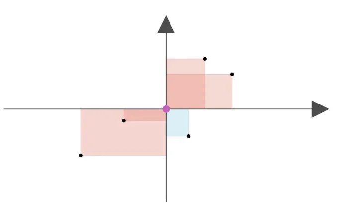 把原点看作 \((\bar{x},\bar{y})\),那么 \(\sum_{i=1}^{n}(x_i-\bar{x})(y_i-\bar{y})\) 就可以理解为这些矩形的面积了