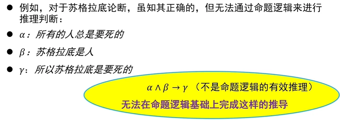不同原子命题蕴含个体、群体、关系等,命题逻辑无法表现;需要分析原子命题,分离其主语和谓语