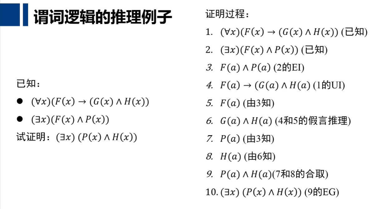 - 谓词中个体变元用个体常量带入后就变成了命题,如 \(\text{car}(x)\) (\(x\) 是车)这个谓词中 \(x\) 用吉普车代替,则 \(\text{car}(\) 吉普车 \()\) 是命题。