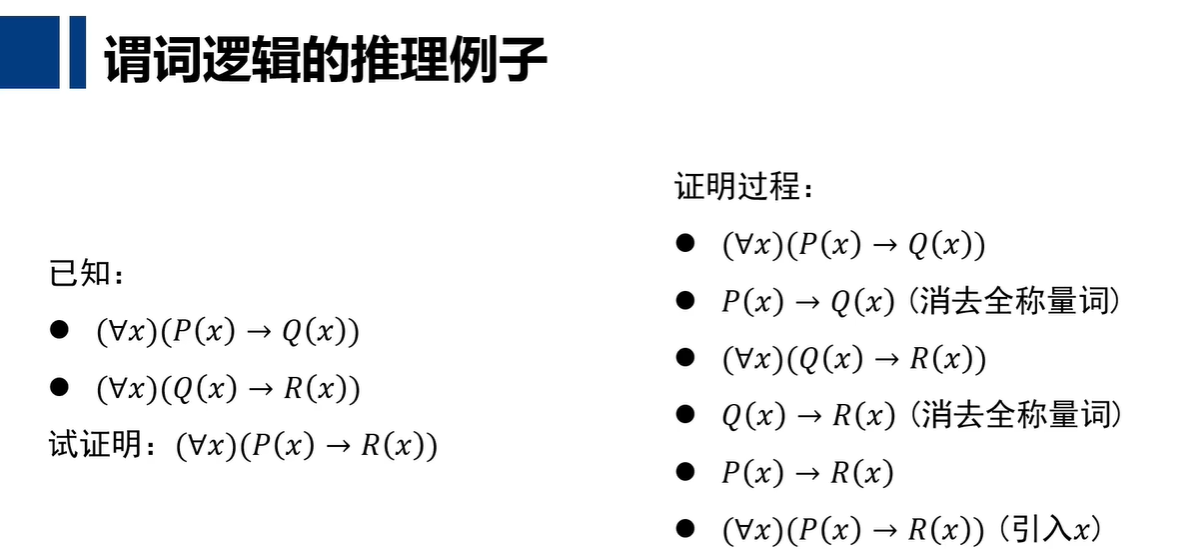 - \(\forall x\) 表示定义域中的所有个体,\(\forall x P(x)\) 表示定义域中的所有个体具有性质 P