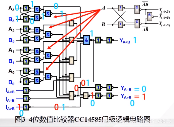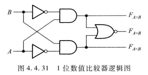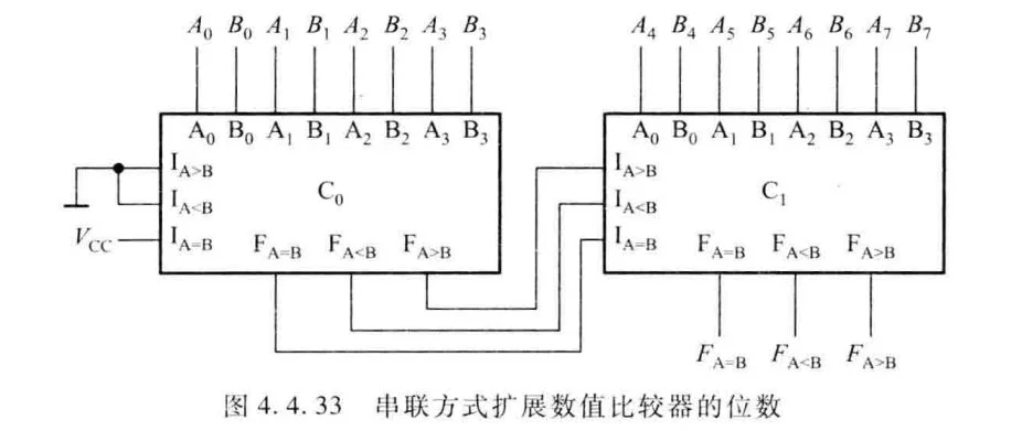 显然,从数据输入到稳定输出只需 2 倍的 4 位比较器延迟时间,若用串联方式,则 16 位的数值比较器从输入到稳定输出需要约四倍的 4 位比较器的延迟时间。