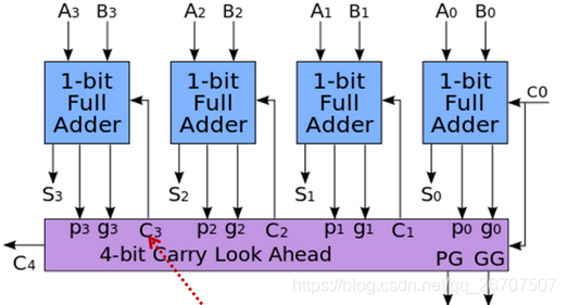 基本原理:加到第 \(i\) 位的进位输入信号是两个加数第 \(i\) 位以前各位 \(0 \ to\ i-1\)的函数,可在相加前由 A,B 两数确定。