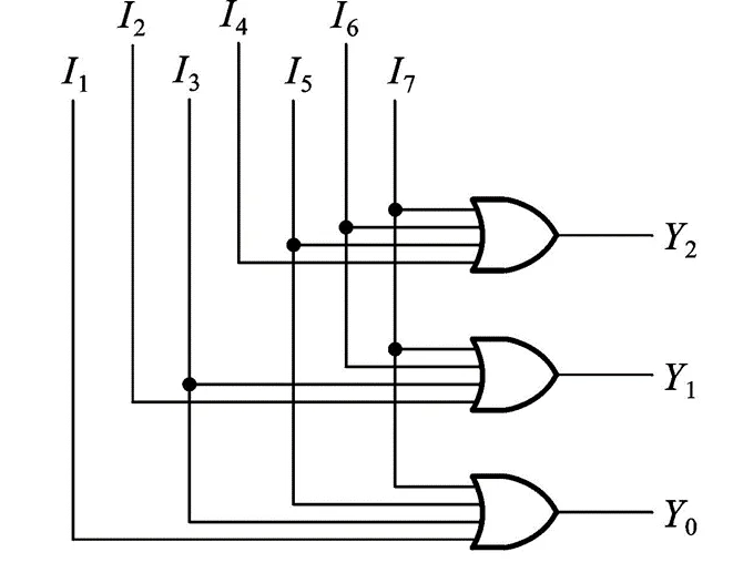 普通编码器的输入端只能同时存在一个高电平信号,当我们不小心输入了多个高电平信号,比如输入 (11111111),根据电路图普通编码器输出的结果为 (111), 与正常输入 (00000001) 的结果相同,但我们从输出端根本无法判断输入了一个错误的信号。