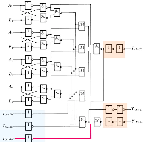 串联需要将后 4 位的比较结果作为输入,最低一级要将 \(I_{A=B} = 1,I_{A>B}= I_{A<B} = 0\)