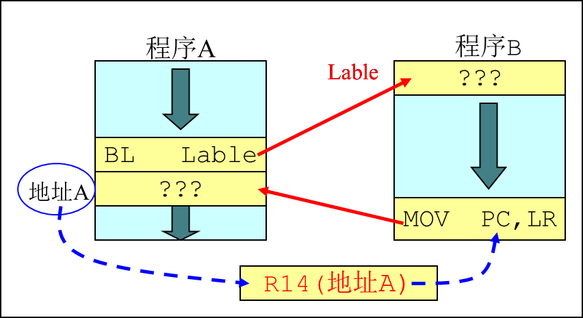 程序 B 执行最后,将 R14 寄存器的内容放入 PC,返回程序 A