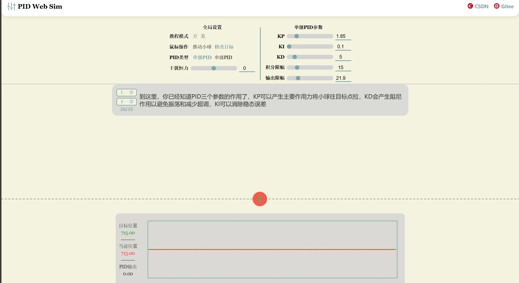 使用教程讲述了单级 PID 和串级 PID 的基本实现。可以动态调节参数对小球进行控制