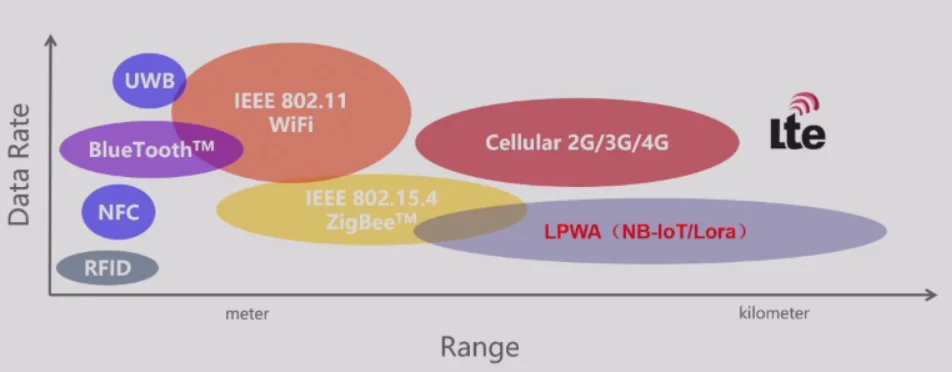 | 覆盖范围 | 短(<100 米) | 中(50-300 米) | 短(10-100 米) | 广域(千米级) |