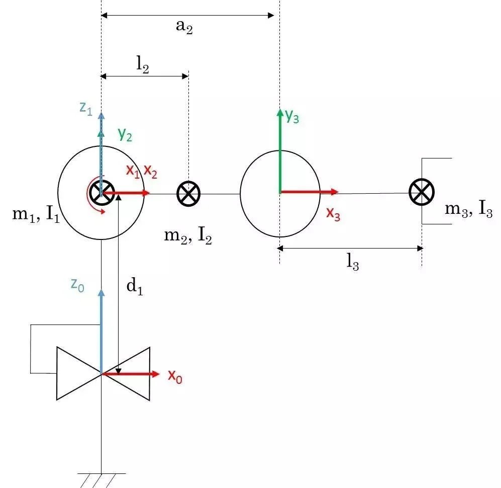 $$ M=begin{bmatrix}times&m_2l_2c_2+m_3(l_3c_2c_3+a_2c_2-l_3s_2s_3)&-m_3(l_3s_2s_3-l_3c_2c_3)\times×&l_{zz3}+m_3(l_3^2+a_2l_3c_3)\times××end{bmatrix} $$