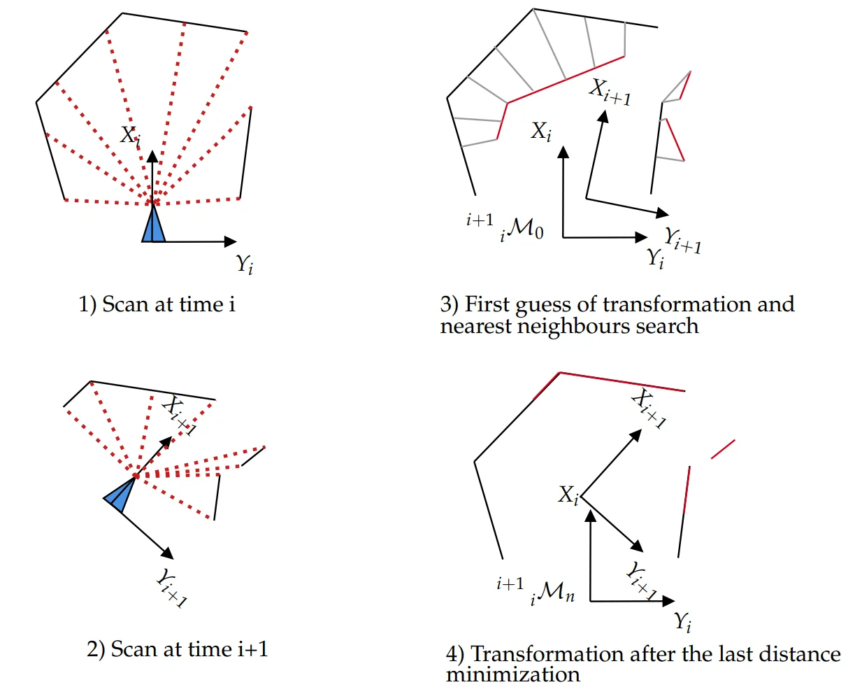 激光里程计的实现可以看做是点云的匹配和激光数据校正 ICP(Iterative Closest Point, 迭代最近点 )