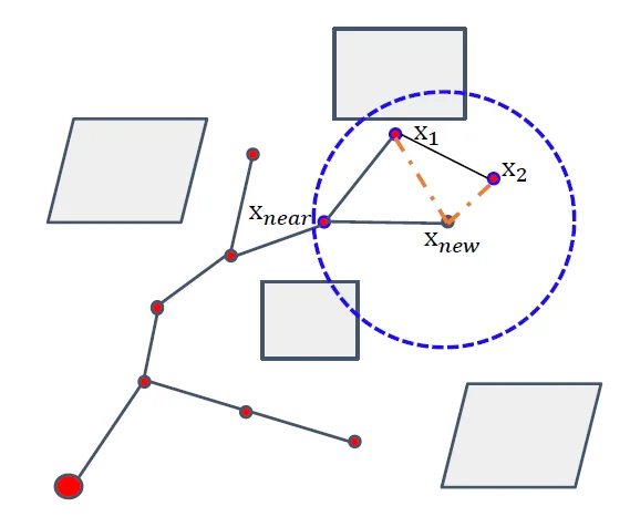 - rewire:即在采样之后与最短路径连接后,考虑在某一个定长的圆的范围内,其内的点是否可以连接到新采样的点(用到初始点的距离进行判断)