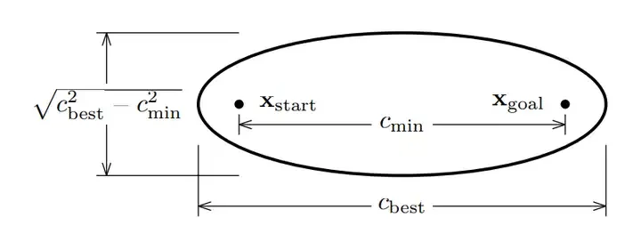 以起点 \(x_{start}\) 和终点 \(x_{goal}\) 作为椭圆的焦点,令 \(a\) 等于初始路径长度的一半,即 \(a = \frac{c_{best}}{2}\),则 \(c = \frac{c_{min}}{2}\),\(b = \frac{\sqrt{c_{best}^2 - c_{min}^2}}{2}\)。这样就可以得到椭圆方程的所有参数。