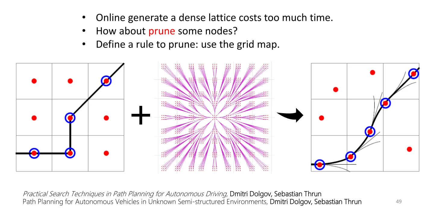 传统的 A * 算法是在栅格地图中进行搜索,可行路径中的点,都是栅格地图的中心点,如下面的第一幅图所示,lattice planner 算法是先构建一个用于搜索的 lattice 图,如下面的第二幅图所示,Hybrid A* 算法结合了 A * 算法和 lattice planner 算法的思想,将栅格地图的路径搜索与 lattice 图结合起来,在搜索过程中选取不同的控制量预演一段轨迹,且保持在每个栅格中仅保留一个可行的状态,如下面的第三幅图所示