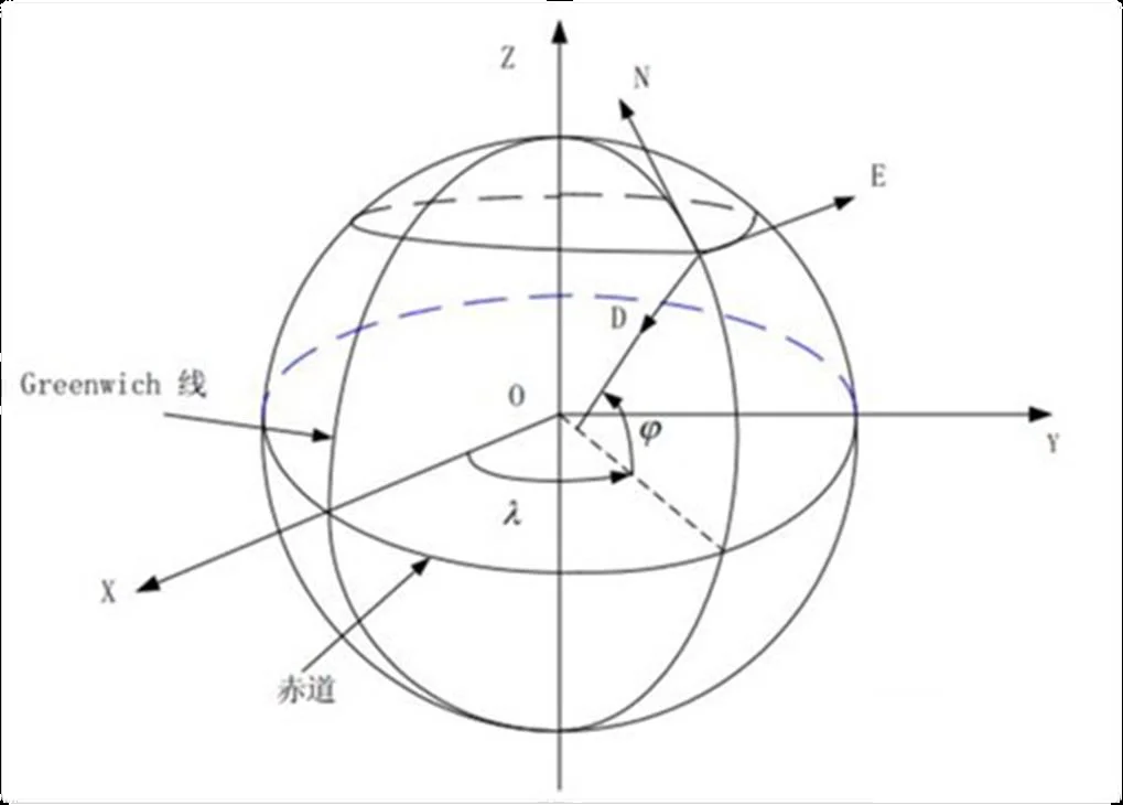 \(X\) 轴通过格林尼治线(0度经线)和赤道线的交点,正方向为原点指向交点方向。\(Z\) 轴通过原点指向北极。\(Y\) 轴与 \(X\),\(Z\)轴构成右手坐标系。
