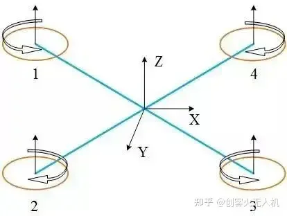 四旋翼有十字和 x 两种,采用正反桨,对侧一致
