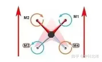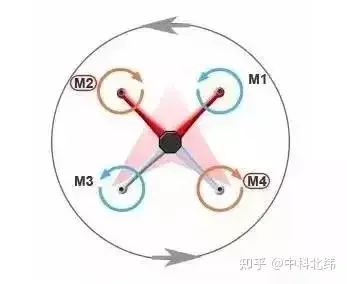 但是当需要飞机原地旋转时,我们就可以利用这种反扭矩,M2、M4 两个顺时针旋转的电机转速增加,M1、M3 号两个逆时针旋转的电机转速降低,由于反扭矩影响,飞机就会产生逆时针方向的旋转。同时由于是“X”型结构对侧的电机同时增加或者降低转速,也保证了飞机的平衡。