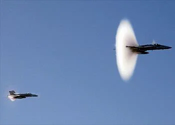 超音速飞行时,激波后的空气压力和温度急剧下降,导致水汽冷凝,形成雾化现象