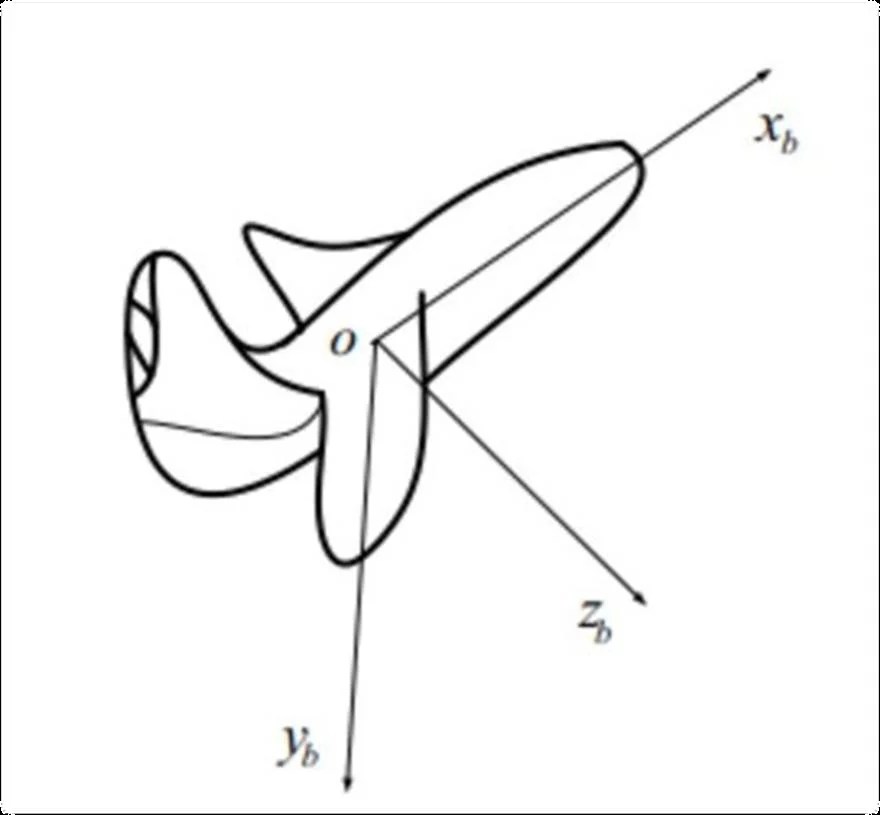 原点在飞行器重心处 \(X\) 轴指向飞行器机头前进方向 ,\(Y\) 轴由原点指向飞行器右侧 ,\(Z\) 轴方向根据 \(X\),\(Y\) 轴由右手法则确定。
