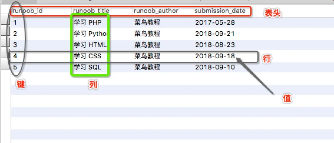 即关系数据库管理系统 (Relational Database Management System) 的特点: 1. 数据以表格的形式出现 2. 每行为各种记录名称 3. 每列为记录名称所对应的数据域 4. 许多的行和列组成一张表单 5. 若干的表单组成database